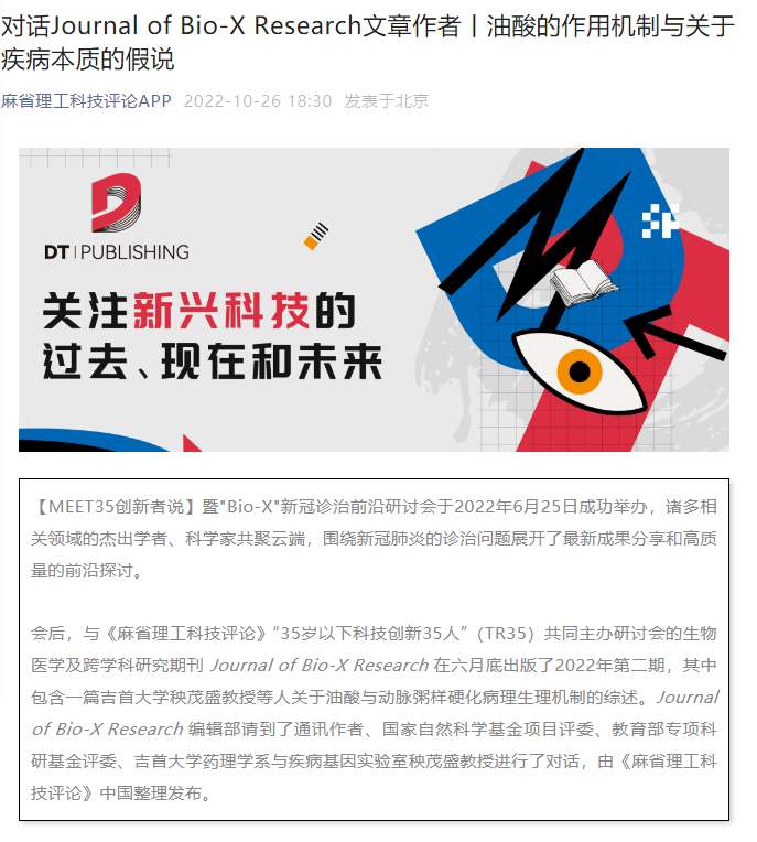 本网讯(通讯员 成江)2022年10月26日,《麻省理工科技评论》中国公众号发表了对太阳集团122cc秧茂盛教授的采访,该采访的主题是“对话Journal of Bio-X Research文章作者丨油酸的作用机制与关于疾病本质的假说”,重点报道了秧茂盛教授的最新研究成果以及未来的研究设想和计划。