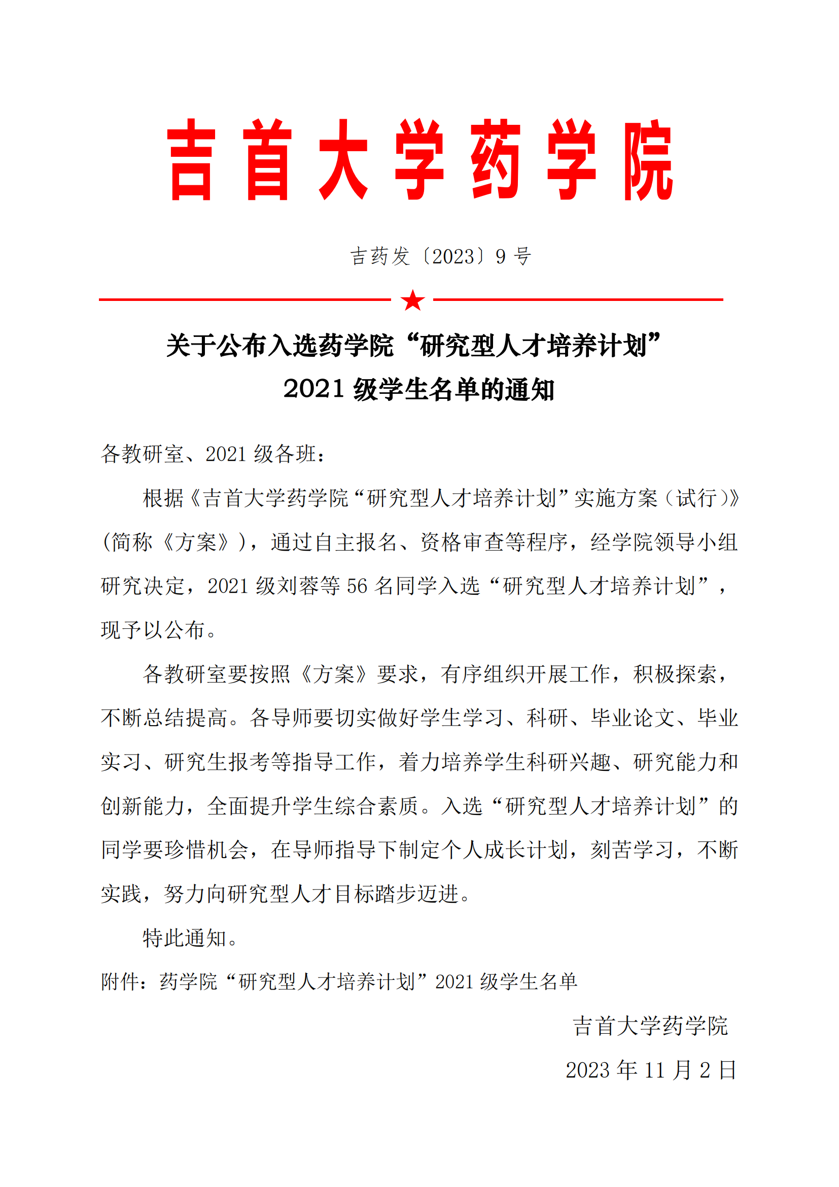 吉药发〔2023〕9号关于公布入选太阳集团122cc“研究型人才培养计划”2021级员工名单的通知.pdf