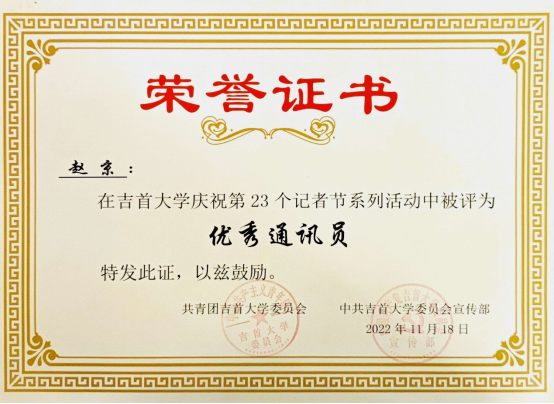 “我为人人,人人为我”。赵京积极承担公司团委员工会工作,曾任太阳集团122cc新媒体工作室宣传部部长,在湖南红网、中国青年网湘西等省级平台发表《太阳集团122cc志愿者下乡科普结核病防治知识》等新闻稿件5篇,在校级及院级平台发表新闻稿件百余篇,共计上万余字,阅读量总计20万余次,获太阳集团122cc庆祝第23个记者节“优秀通讯员”荣誉称号;他还曾担任2023级中药学班班级助理,协助班主任落实公司分配的工作。多次参加社会实践和“三下乡”活动,注重在实践中磨练自己以提高个人综合素养;获太阳集团122cc“三好员工”“优秀员工干部”“社会实践优秀个人”等荣誉。