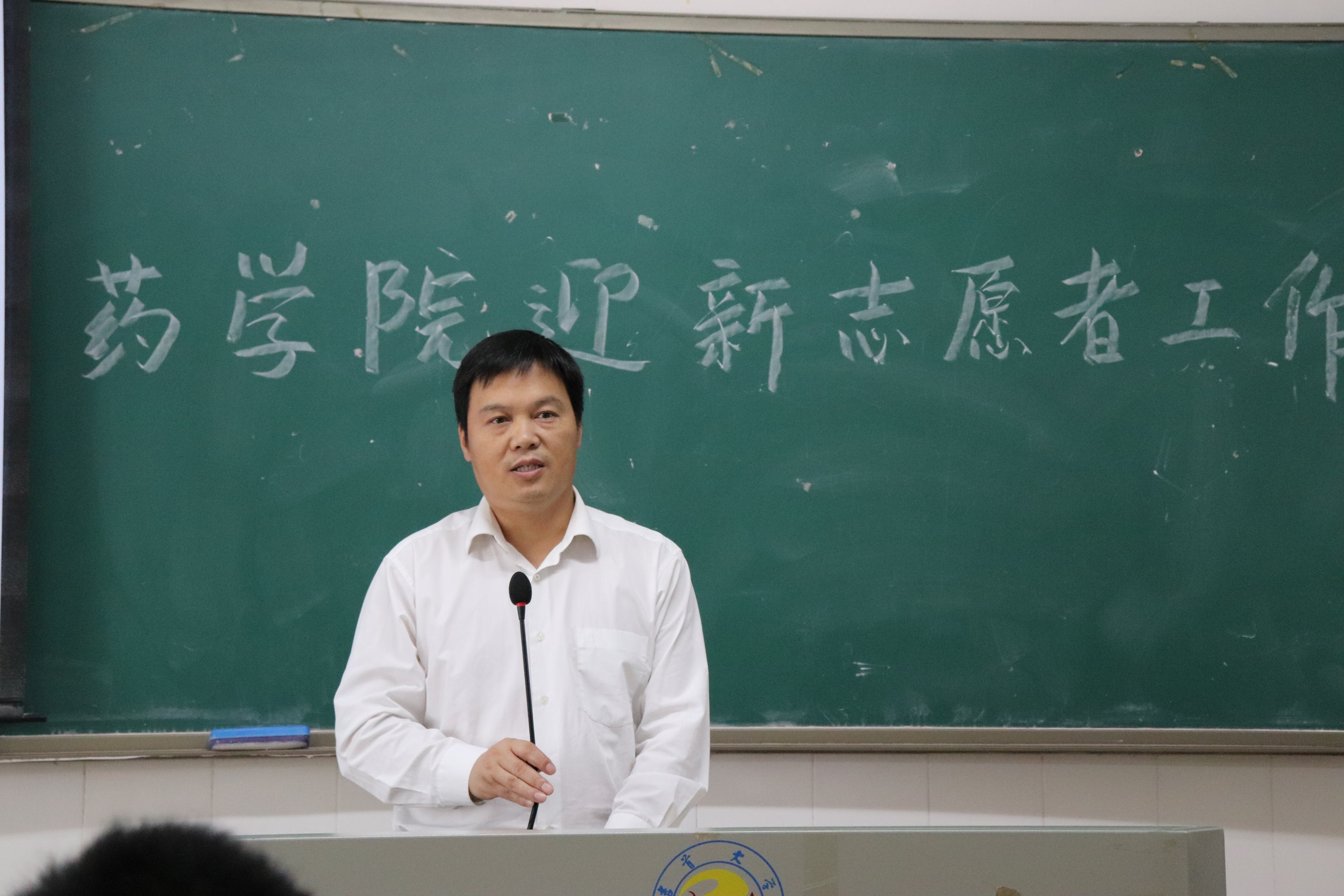 图为  彭俊老师做迎新志愿者工作布置