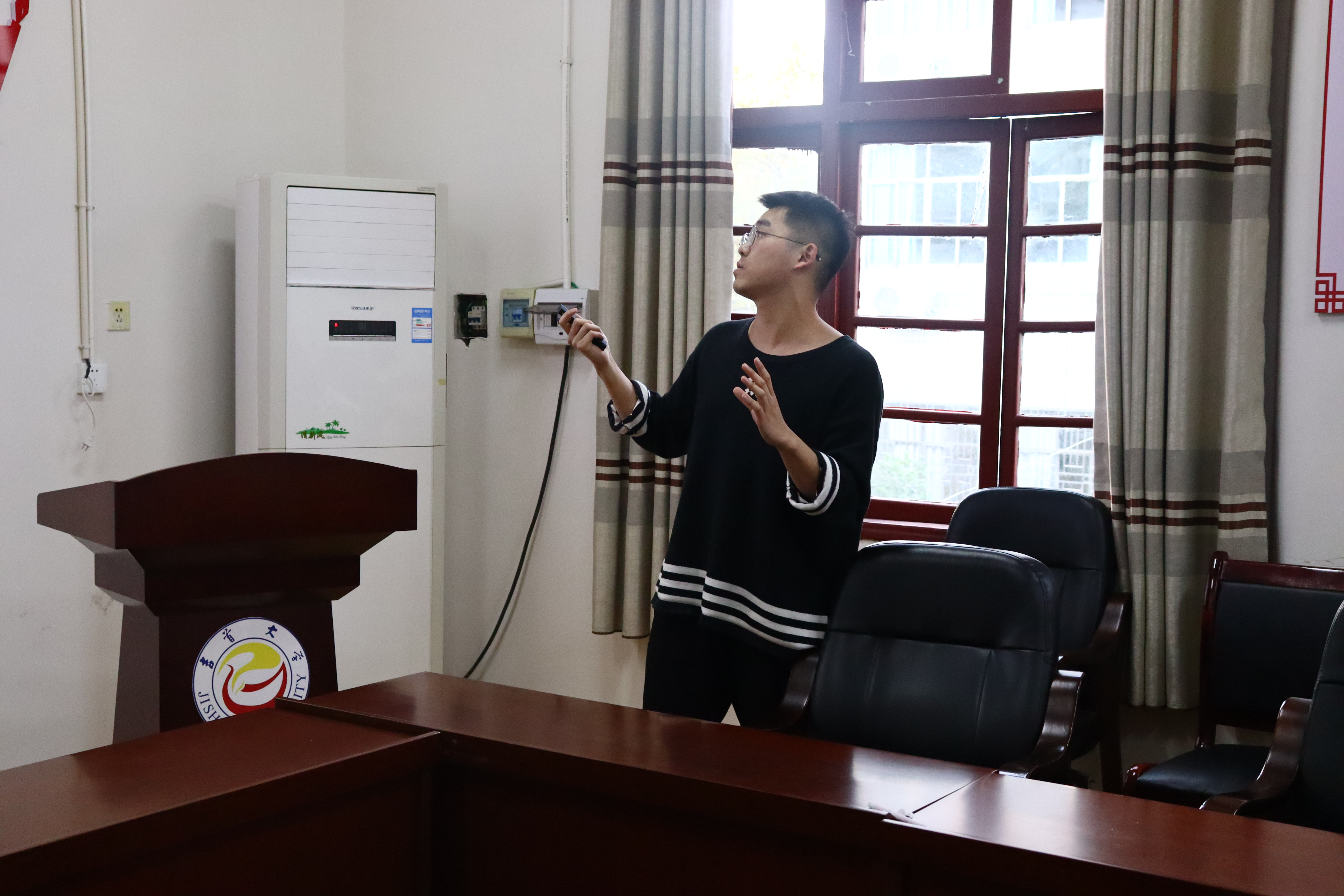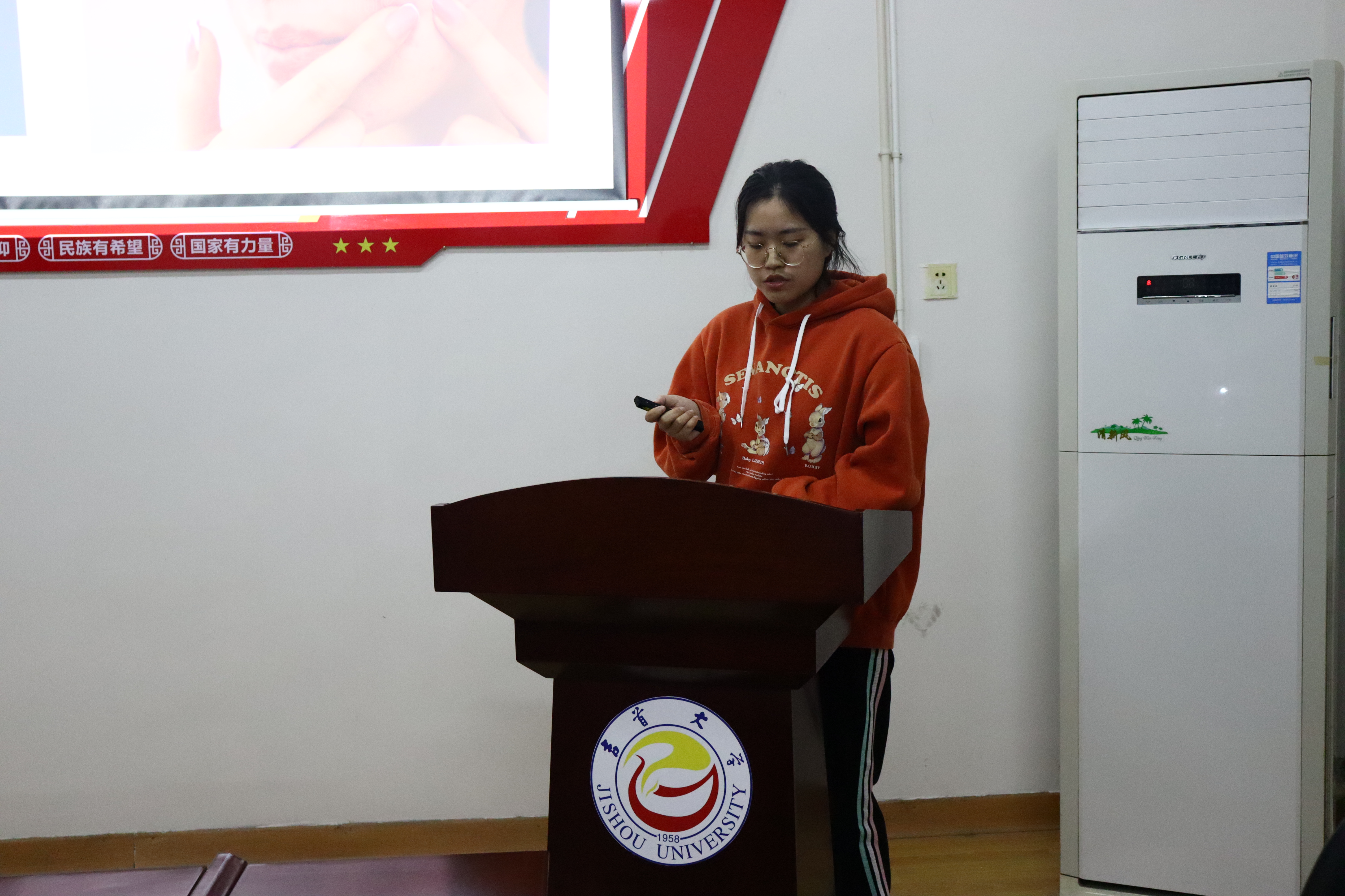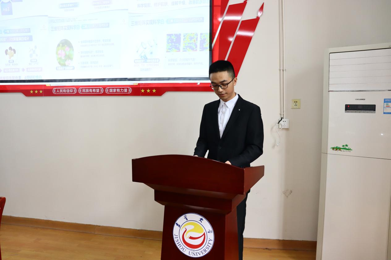 在大会上,各组人员的代表人在台上用精炼的语言以及所相关的视频分别从研究意义、研究背景、研发过程、研发思路等方面将自己的作品展现给在场师生。