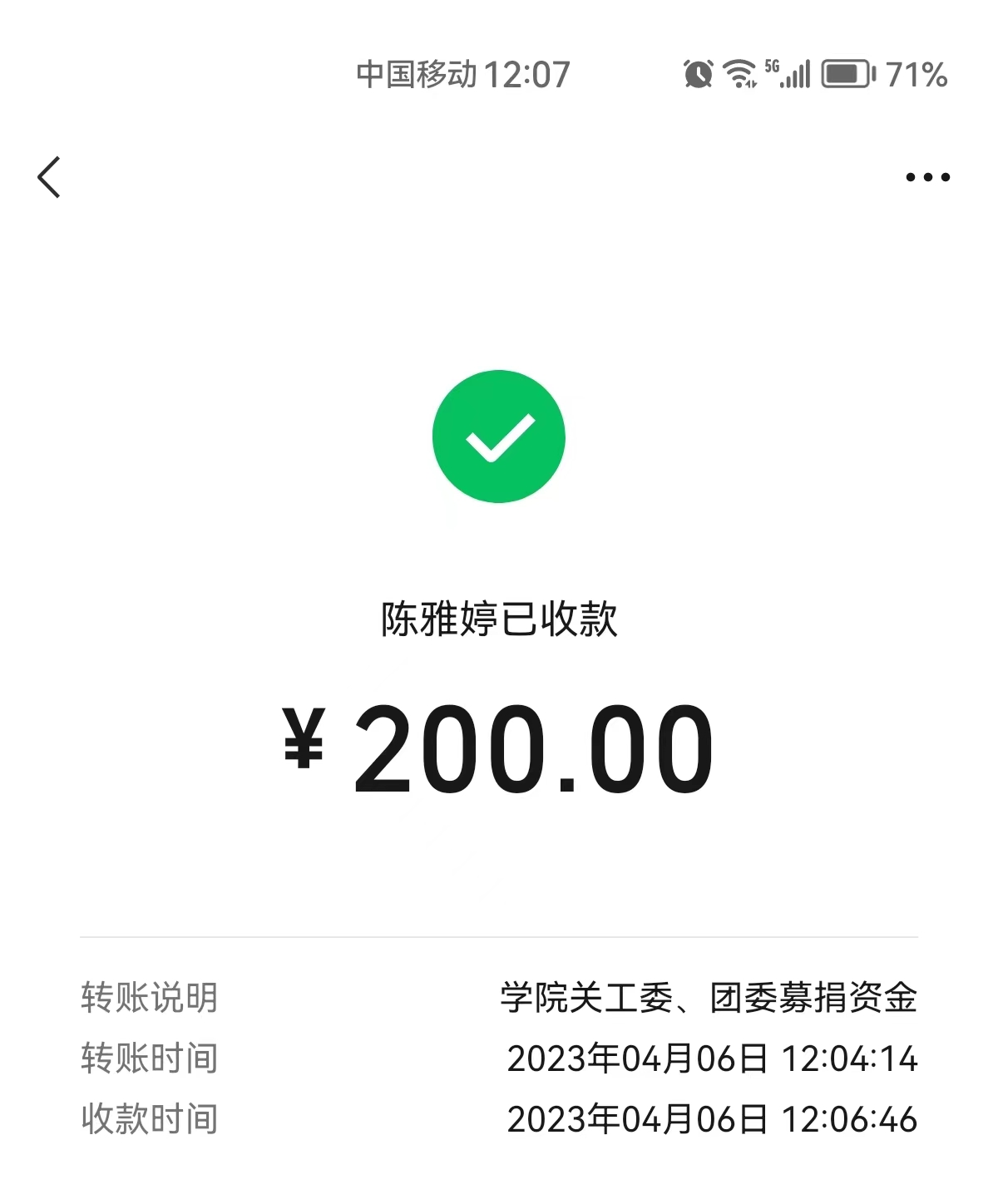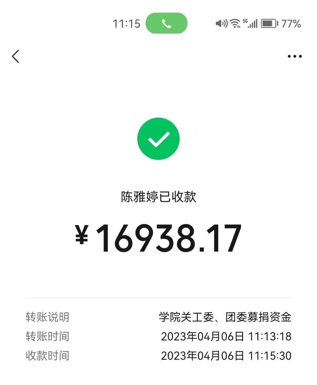 4月6日,募捐金额已转至陈雅婷本人微信账户,并向其本人及家人致以关心和问候。