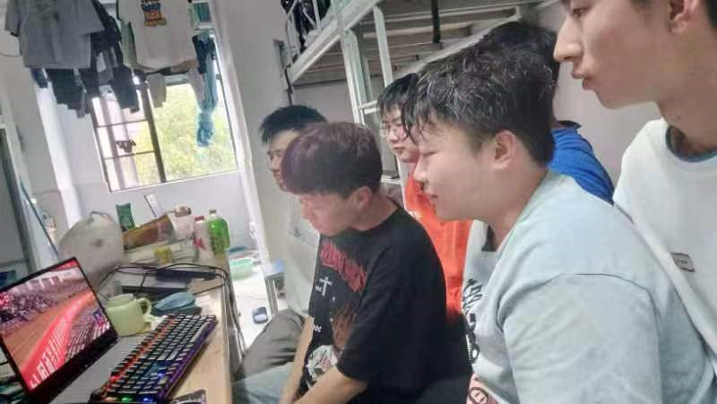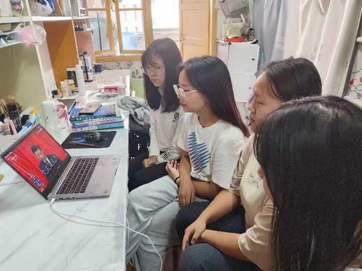 图为 太阳集团122cc员工在寝室收看党的二十大开幕会