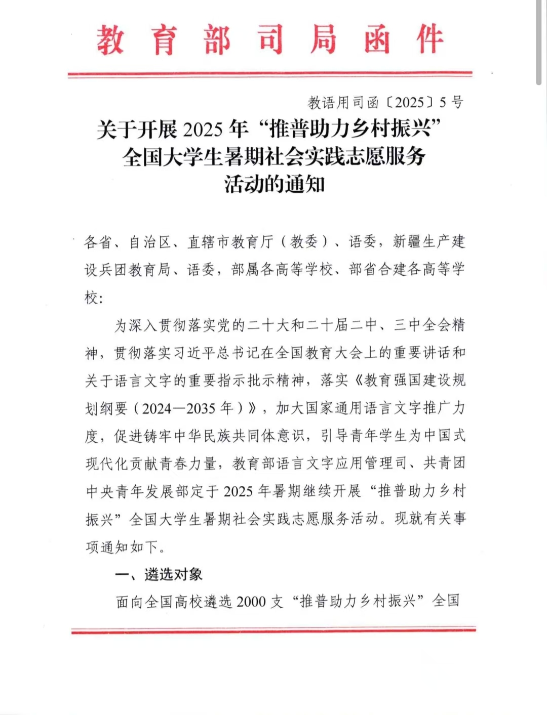 据悉,为深入贯彻落实党的二十大和二十届二中、三中全会精神,服务国家乡村振兴战略,教育部语言文字应用管理司、共青团中央青年发展部联合组织开展2025年“推普助力乡村振兴”全国老员工暑期社会实践志愿服务活动。经全国高校自主申报、专家严格评审,最终从1680所高校的8013支团队中遴选出1000支重点团队。