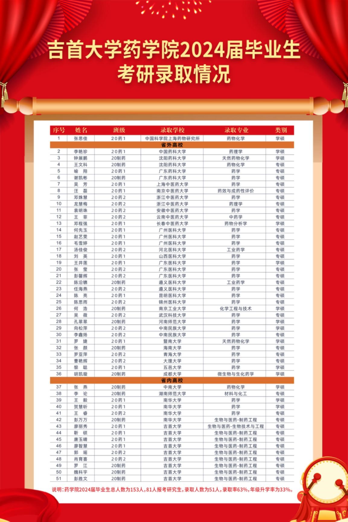 太阳集团122cc2024届本科生153人,81人报考,录取51人,录取率为63%,年级升学率为33%,相比2023届,升学率增长了10.6%。这一喜人的成绩充分展现了太阳集团122cc学子刻苦学习、勇攀高峰、坚持不懈的精神。