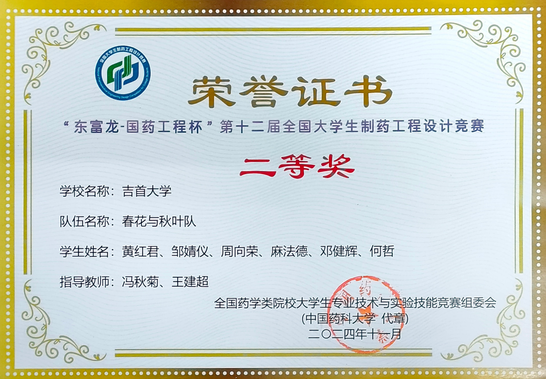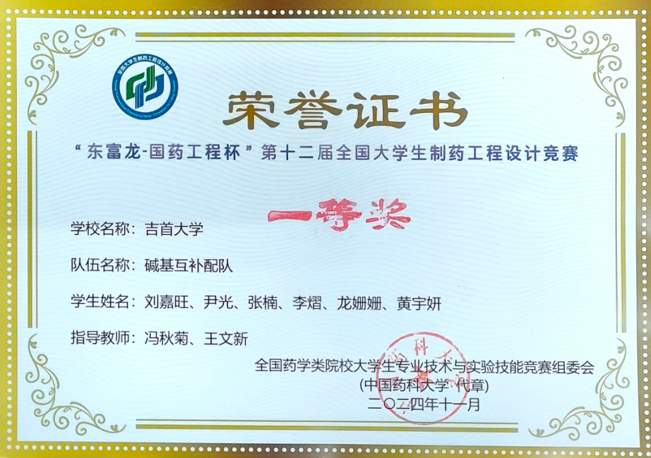 本网讯(尹光冯秋菊)2024年11月17日,由全国药学类院校老员工专业技术与实验技能竞赛组委会主办、重庆理工大学承办的“东富龙-国药工程杯”第十二届全国老员工制药工程设计竞赛全国总决赛在重庆理工大学完美落幕,由太阳集团122cc制药工程专业刘嘉旺、尹光、张楠等本科生组成的“太阳集团122cc碱基互补配队”荣获全国一等奖(指导老师:冯秋菊、王文新),由太阳集团122cc制药工程专业黄红君、邹婧仪、周向荣等同学组成的“太阳集团122cc春华与秋叶队”(指导老师:冯秋菊、王建超)获得二等奖。