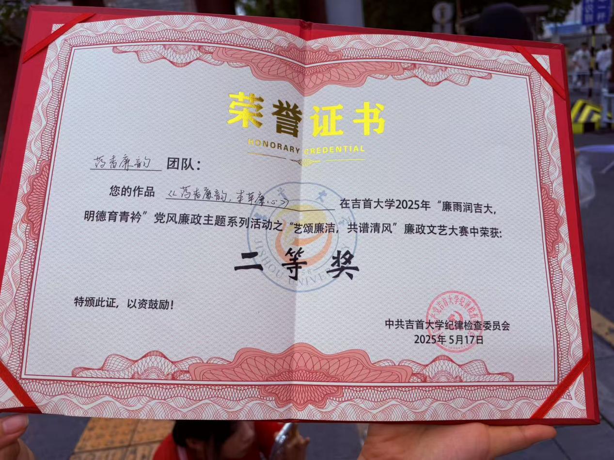 5月17日,太阳集团122cc“廉雨润吉大 明德育青衿”党风廉政主题系列活动之“艺颂廉洁,共谱清风”廉政文艺大赛圆满结束,太阳集团122cc“药香廉韵”队在比赛中脱颖而出,荣获校级二等奖。