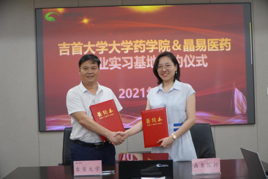 王江生一行与晶易医药副总经理唐靖、人力资源负责人唐叶萍、人事主管刘维等进行座谈交流,双方就科研合作、人才培养、毕业生实习就业等方面进行了沟通交流。王江生、唐靖分别代表公司和企业双方签订了校企合作协议和实习基地共建协议。