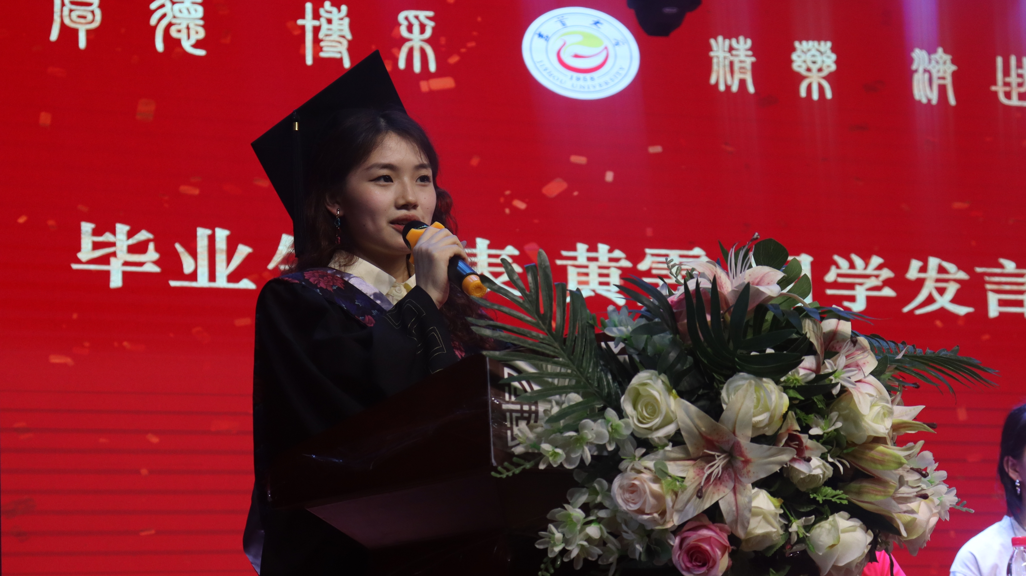 毕业生代表黄雯发言。回顾自己从大一到大四在班长、党务助理等干部工作及考研学习中的成长蜕变,回顾获得的荣誉与成绩,她十分感激母校、公司、老师和同学们。她热情洋溢地激励全体毕业生要勇担时代使命,特别是在医药等关乎人民健康的重要领域,用实际行动践行报效祖国的远大志向。她还特别寄语学弟学妹,希望大家要以校训和院训精神为指引,勇敢迎接挑战,执着追逐梦想。最后,黄雯为公司、老师、学弟学妹以及全体毕业生送上了最美好的祝福,祝愿大家在未来的道路上都能书写属于自己的精彩篇章。