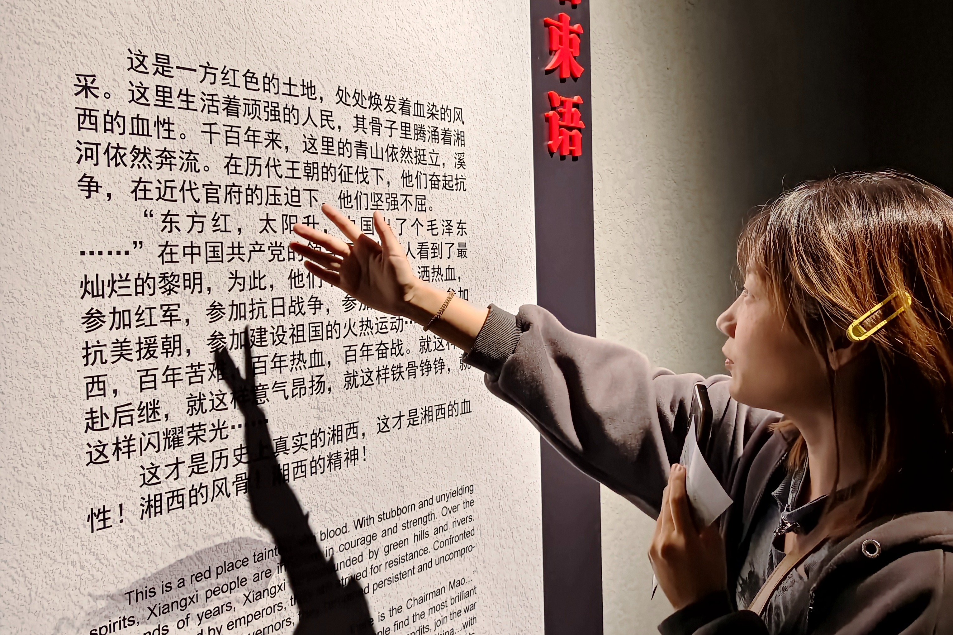 血性湘西展示厅中介绍到:湘西是一方红色的土地,既是湘鄂西、湘鄂川黔革命根据地的重要组成部分,又是红二、六军团长征出发地。在这片红色的土地上,留下了无数革命先烈的战斗足迹。同学们近看沉甸甸的革命文物,详细了解革命文物背后波澜壮阔的红色故事,缅怀革命前辈的丰功伟绩,感恩生在繁荣昌盛的伟大时代。