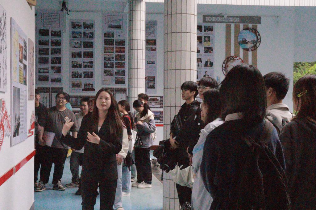 图为 解说员带领同学们参观思政园