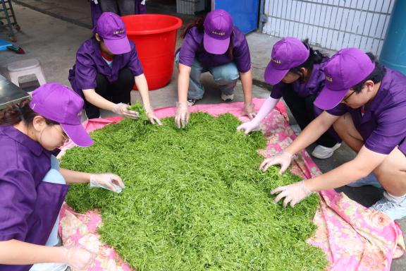 图为 成员们体验莓茶加工过程