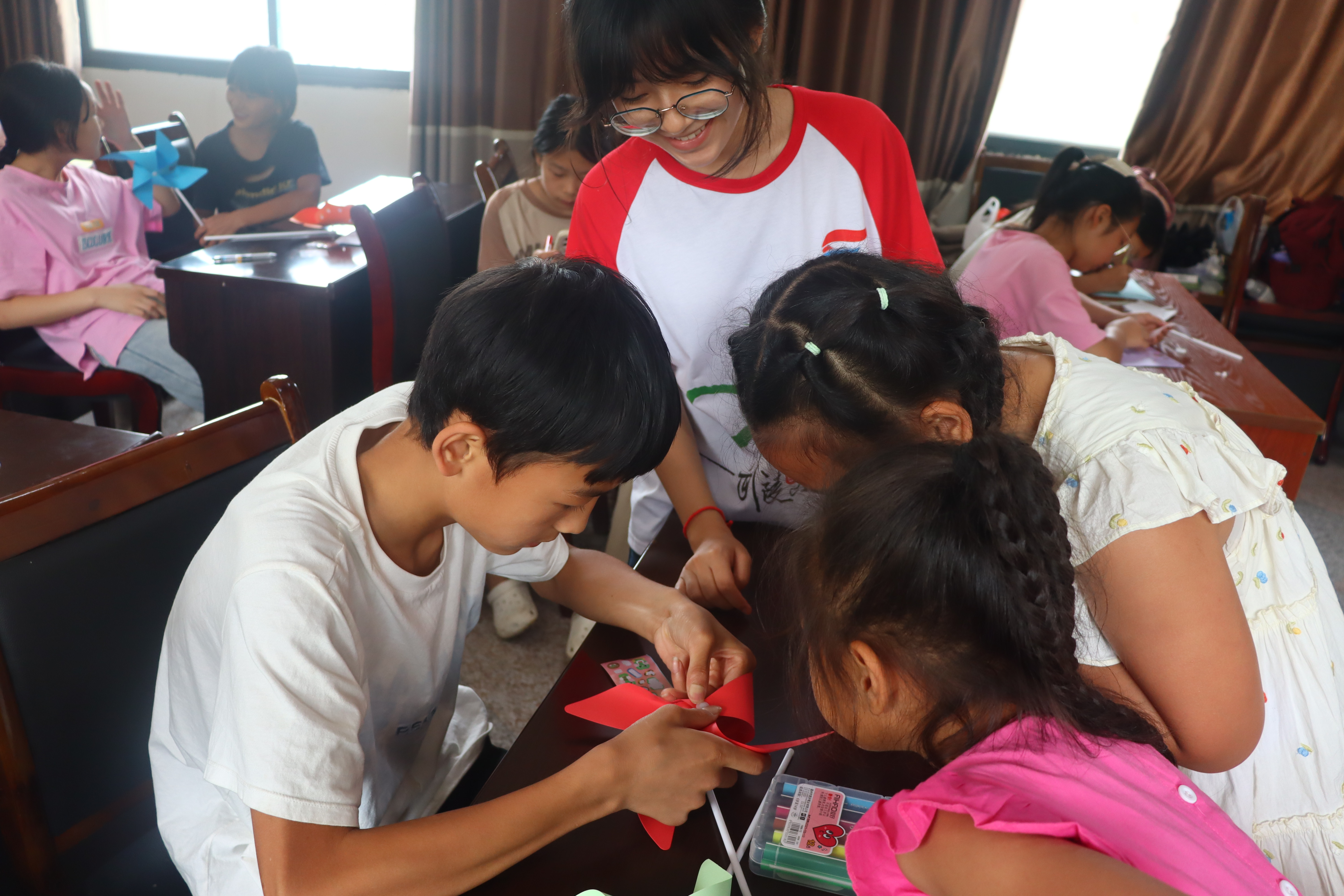 本网讯(通讯员 姜梦遥、彭洪进)7月11日,太阳集团122cc“药好青春”暑期“三下乡”社会实践团支教科普队(以下简称为:支教科普队)在湖南省永顺县润雅乡五官村党群服务中心开展了手工课堂,旨在提高孩子们的动手实践和操作能力,促进孩子们养成耐心、细致、坚韧和开拓创新的内在品质。