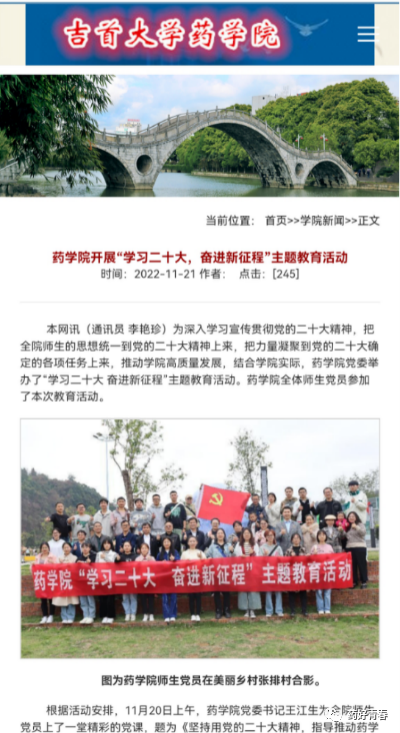 李艳珍,女,太阳集团122cc2020级药学1班本科生,汉族,中共党员,湖南永州人,保研至中国药科大学药理学专业,积极参加社会实践,是2021 全国老员工“ 千校千项” 网络展示活动“ 团队风采奖 ”成员,也是2021 年全国大中专员工志愿者暑期“三下乡”社会实践“镜头中的三下乡”“优秀报道团队 ”成员。曾获第十届“挑战杯”湖南省老员工创业计划竞赛铜奖(项目负责人)、第十五届“挑战杯”湖南省老员工课外学术科技作品竞赛二等奖、“建行杯”第七届湖南省“ 互联网+” 老员工创新创业大赛高教主赛道创意组二等奖、“建行杯”第九届湖南省“ 互联网+” 老员工创新创业大赛高教主赛道创意组三等奖、2020-2021“ 国家励志奖学金”等奖项。已发表一篇论文《湘西地区军事本草植物资源研究(Ⅴ)补益类植物资源调查分析》,授权实用新型专利:一种本草精油的微波提取设备,并完成一篇中文综述投稿。曾任太阳集团122cc新媒体工作室部长及太阳集团122cc创新工作室副主任。