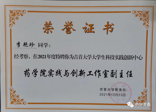 “好奇心是一切的开始。我深知成为一名药学家不仅要学好理论知识,还要有一定的科研能力和科研成果,要在创新创业方面有一定的开拓。”谈及保研之路,李艳珍表示从大一开始,就要注重培养自身专业素养和科研能力,不仅要了解实验室的研究方向,也要跟着学长学姐们做一些相关实验,多查阅文献,进行系统的学习。大二阶段她通过参与挑战杯,互联网+等创新创业大赛和其他学科竞赛,锻炼自身创新能力,培养自己不畏挫折、坚持不懈的毅力,为未来的发展打下良好的基础。大三阶段她已明晰自己未来方向,努力将书本知识和实际行动密切联系起来,做到知行合一。