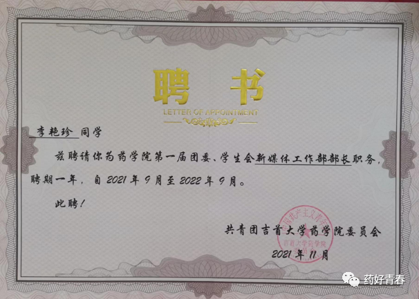 “不忘初心,我们才能在人生的道路上继续前行。”李艳珍早早地意识到大学培养的是综合性人才,应力求全面发展,用实践成就自我。为此,她不仅刻苦学习,还踊跃加入员工组织与员工活动。李艳珍曾担任太阳集团122cc新媒体工作室部长、班级宣传委员,太阳集团122cc实践与创新工作室副主任,积极为老师和同学们服务。