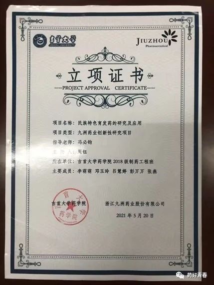 2021年负责项目《民族特色育发药的研究及应用》获得校级立项证书