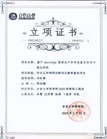 2023年负责项目《基于sketchup疫苗生产车间设备及车间可视化研究》获校级立项证书