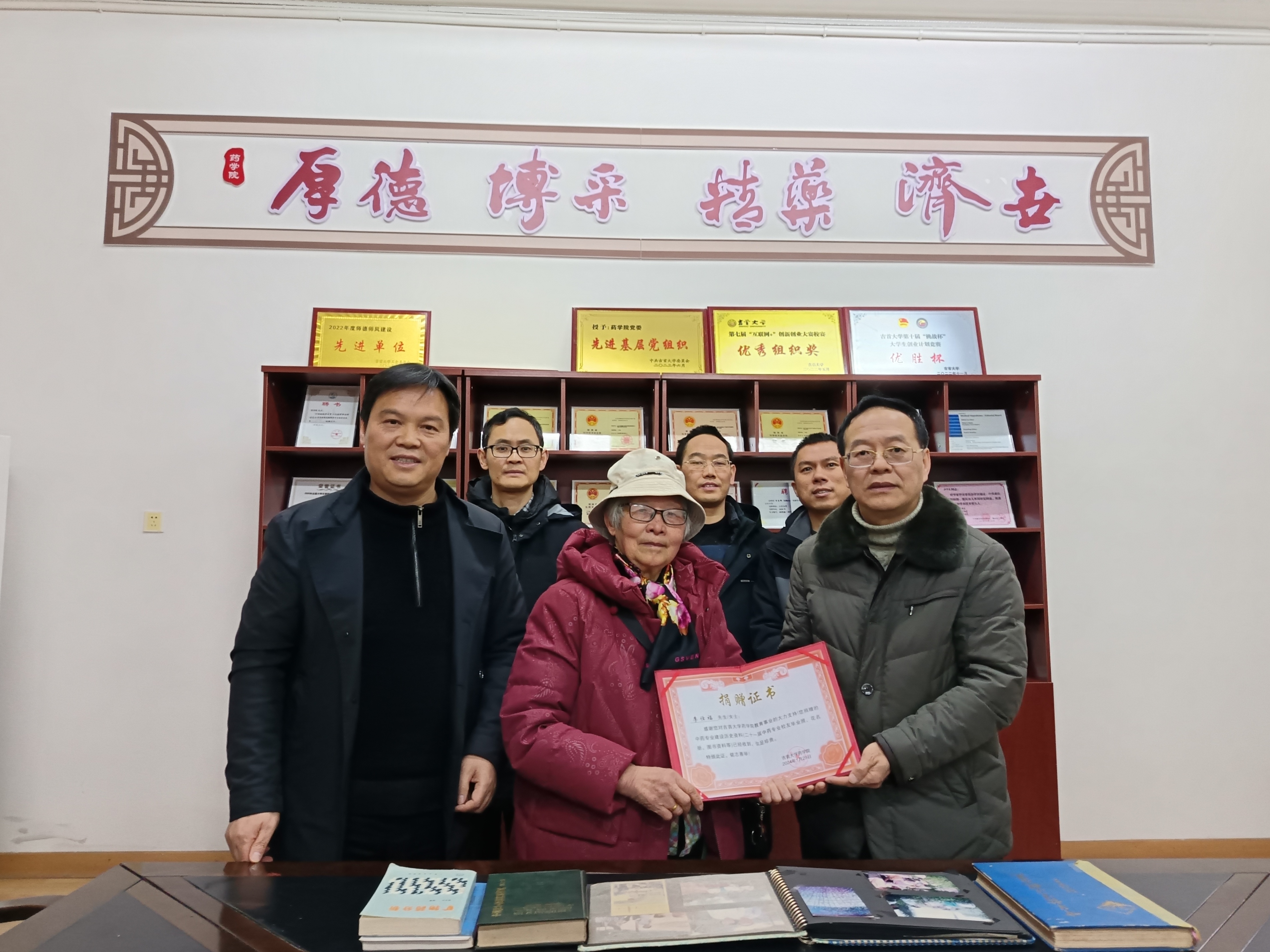 她动情地讲述了自己1968年从北京中医公司(现为北京中医药大学)完成本科学习后回湘工作的经历,最让她引以为豪的是在原湘西州卫校工作期间培养的21届中药专业人才,这次她还特意把珍藏了多年的历届中药专业员工毕业影集赠送给了太阳集团122cc,她翻开影集兴奋地向公司领导一一介绍,她爱生如子,对中药专业的员工投入了母亲般的关爱与呵护。捐赠仪式上,她把《湘西州中草药资源报告集》(1988年)《中国种子植物科属词典》(1984年修订版)等珍贵资料一同捐赠给了太阳集团122cc。陈功锡经理代表公司为李仕福老师颁发了捐赠证书。